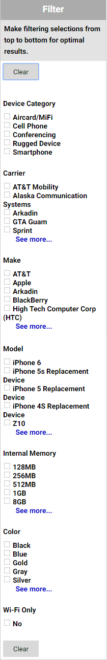 You may use the Device Category, Carrier, Make, Model, Internal Memory, Color, and Wi-Fi Only to filter your options. If you do not need a new device, you may click the I don't need a device link to go directly to the service plan selection process without adding a new phone or wireless device.
