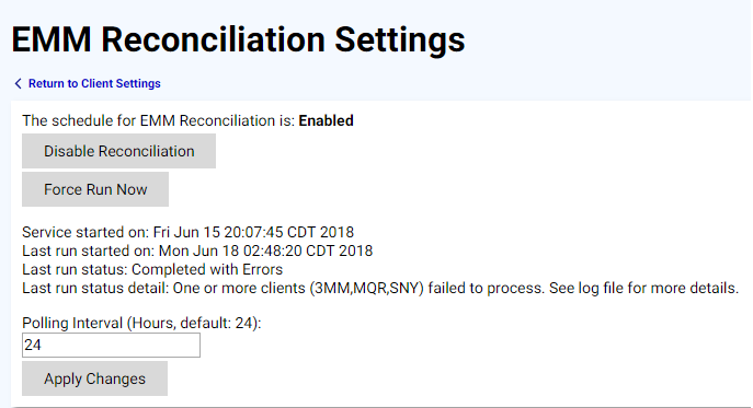 2. In the Client Settings menu, click the EMM reconciliation Settings link.