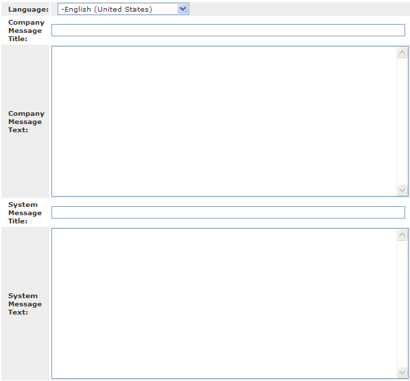 d. To add Company Messages to the Home page, click the Edit link to open the Client Home Page Messages screen. Select the display Language from the drop-down list, enter company and/or system message titles, enter your company and/or system messages, and click the Save button.