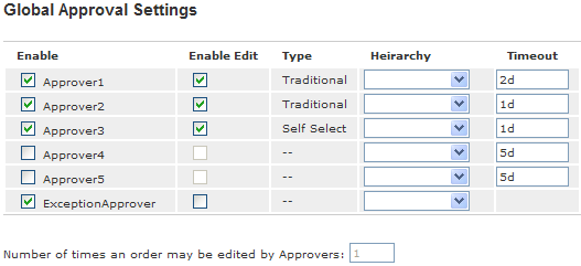 b. Select the Enable Edit checkboxes for the approver levels to which you want to grant permission to edit orders.
