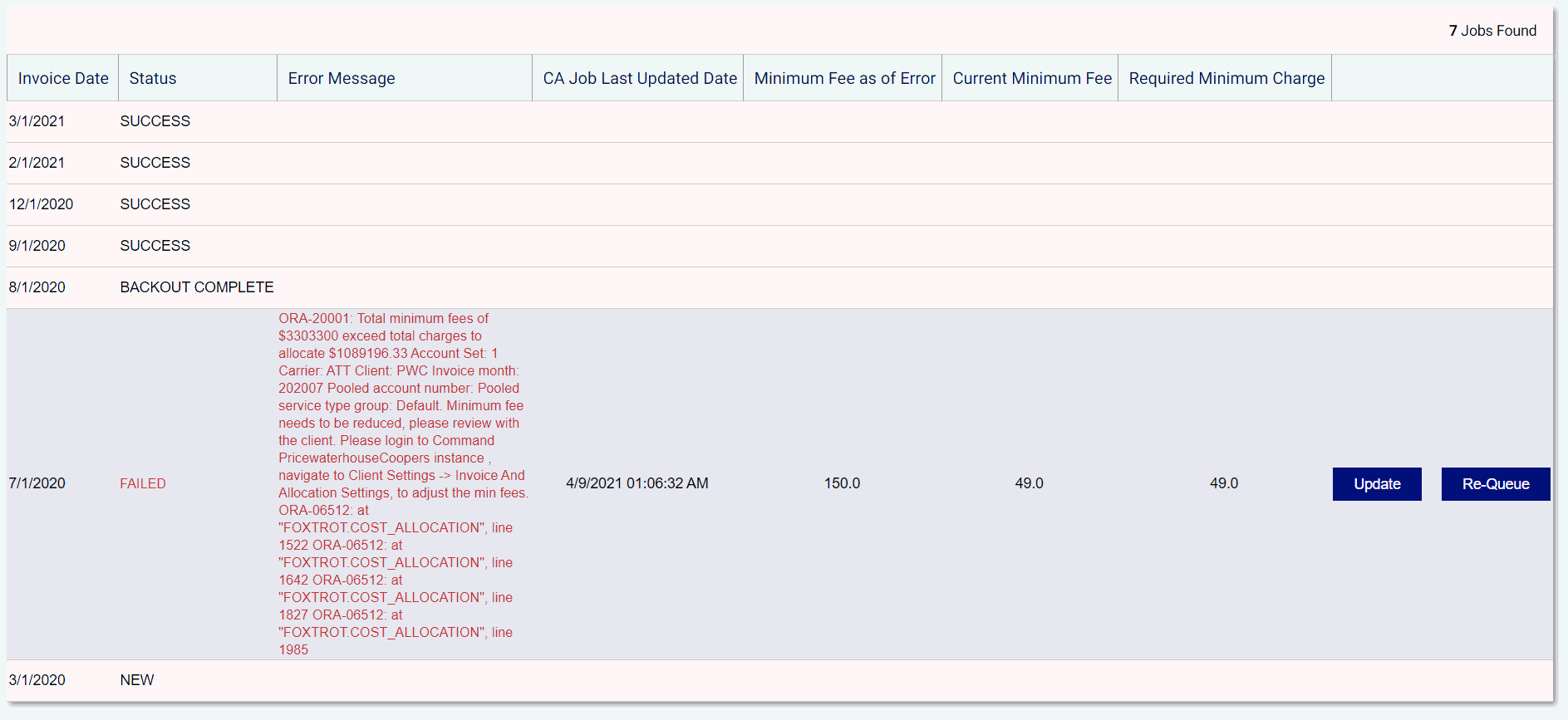 5. If there is an error message, you can click on Update to Update the allocation Settings or click on Re-Queue job to re-queue the job.
