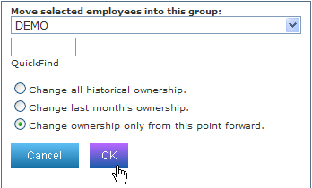 e. In the Move selected employees into this group section, locate the department to which you want to move your selected user, select a charges option, and click the OK button.