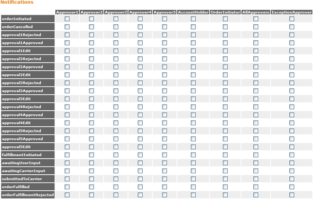 a. Use the checkboxes to select the conditions that trigger procurement notifications and to whom those procurement notifications will be sent when triggered.