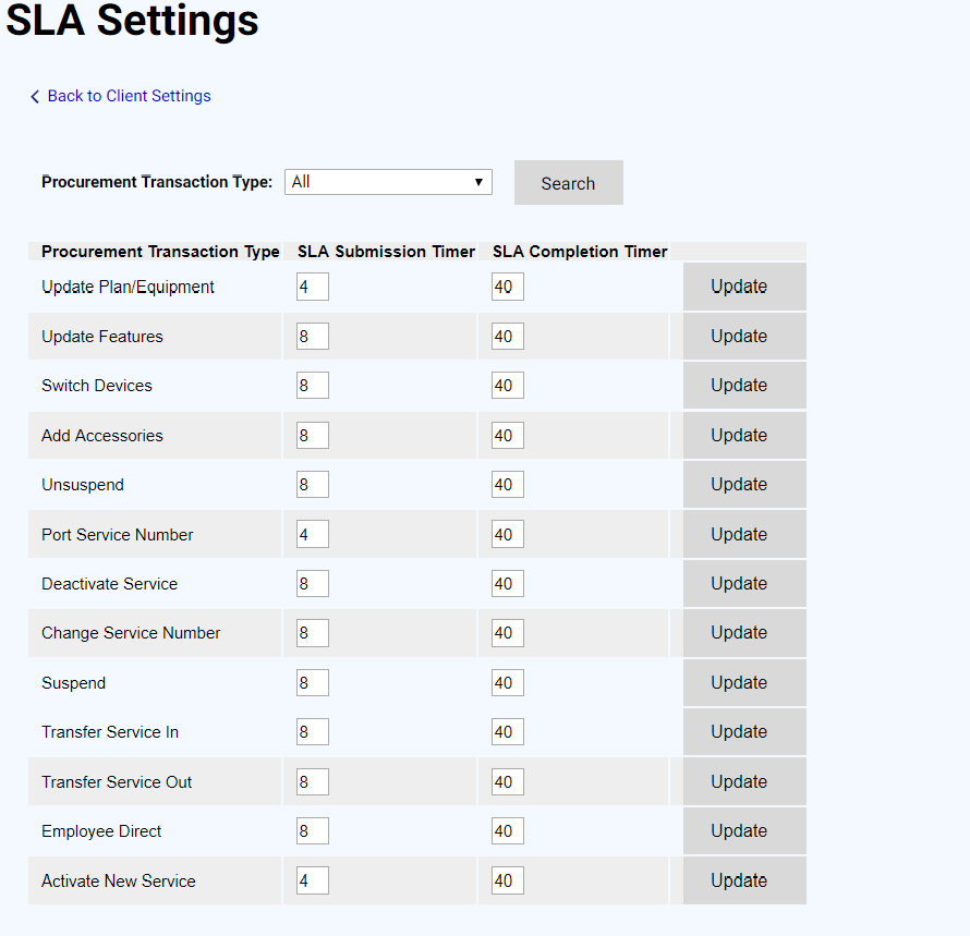 4. In the Procurement Transaction Type field, select the transaction type for which you want to set the SLA and click Search.
