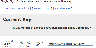 To view the current key, set the login URL, choose whether or not to override the login URL, generate a new key, insert a key, or disable SSO: