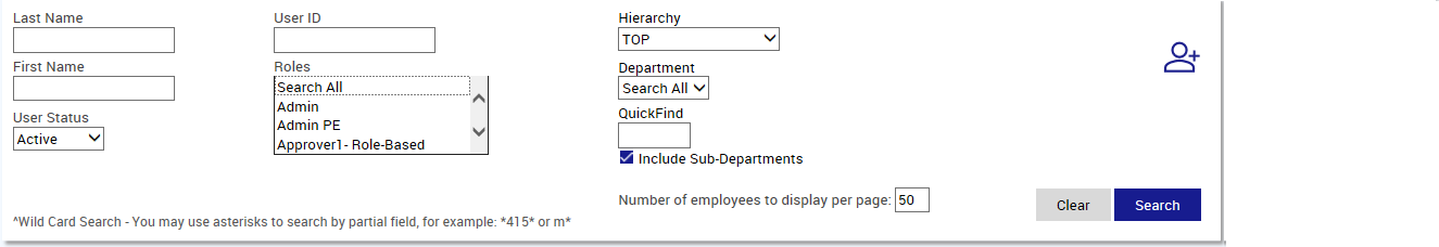 a. Enter or select your search parameters including Last Name, First Name, User ID, Roles, User Status, Hierarchy, and/or Department.
