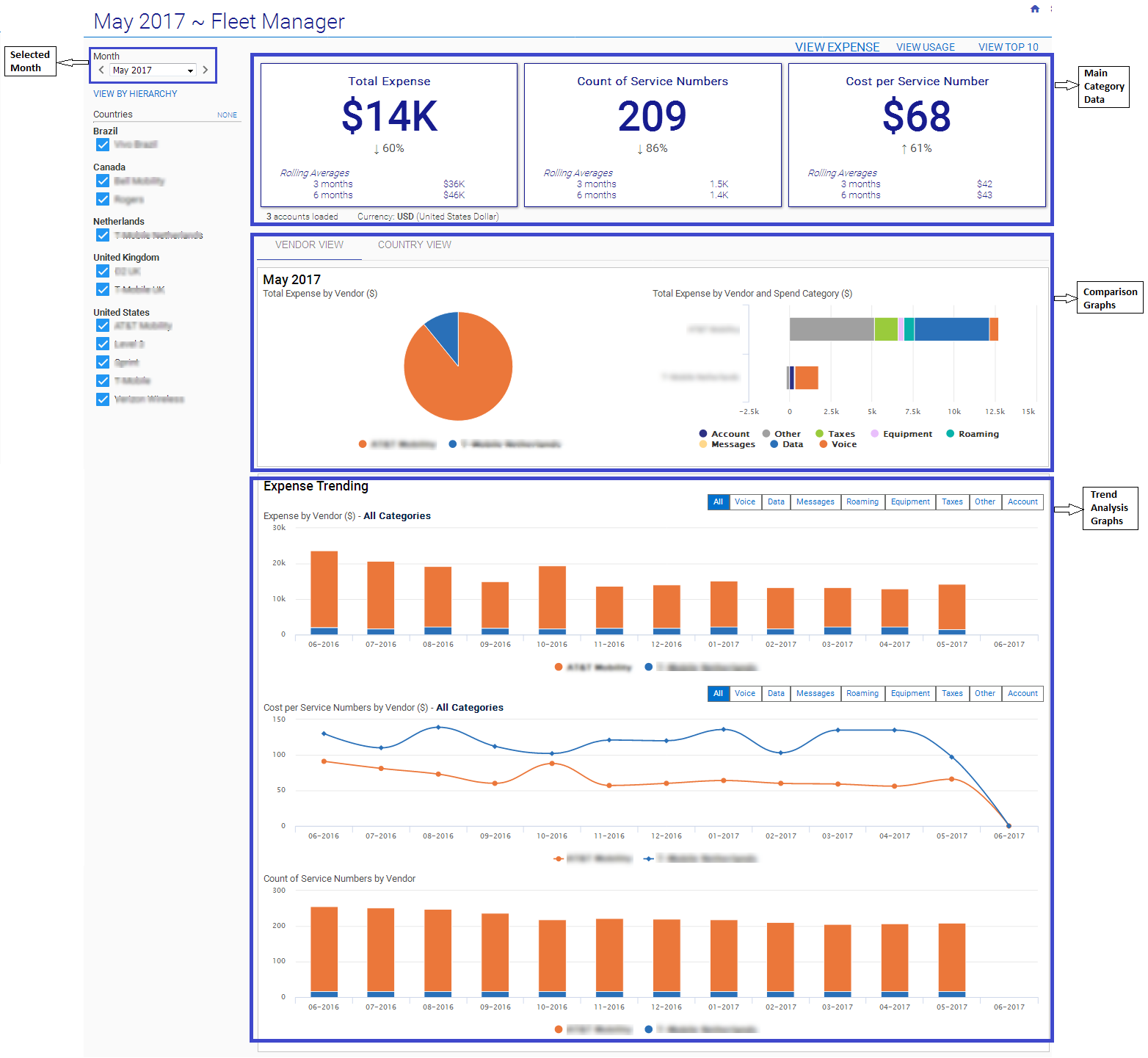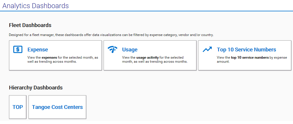 Fleet Dashboards - These dashboards offer data visualizations which can be filtered by expense category, vendor and/or country.
